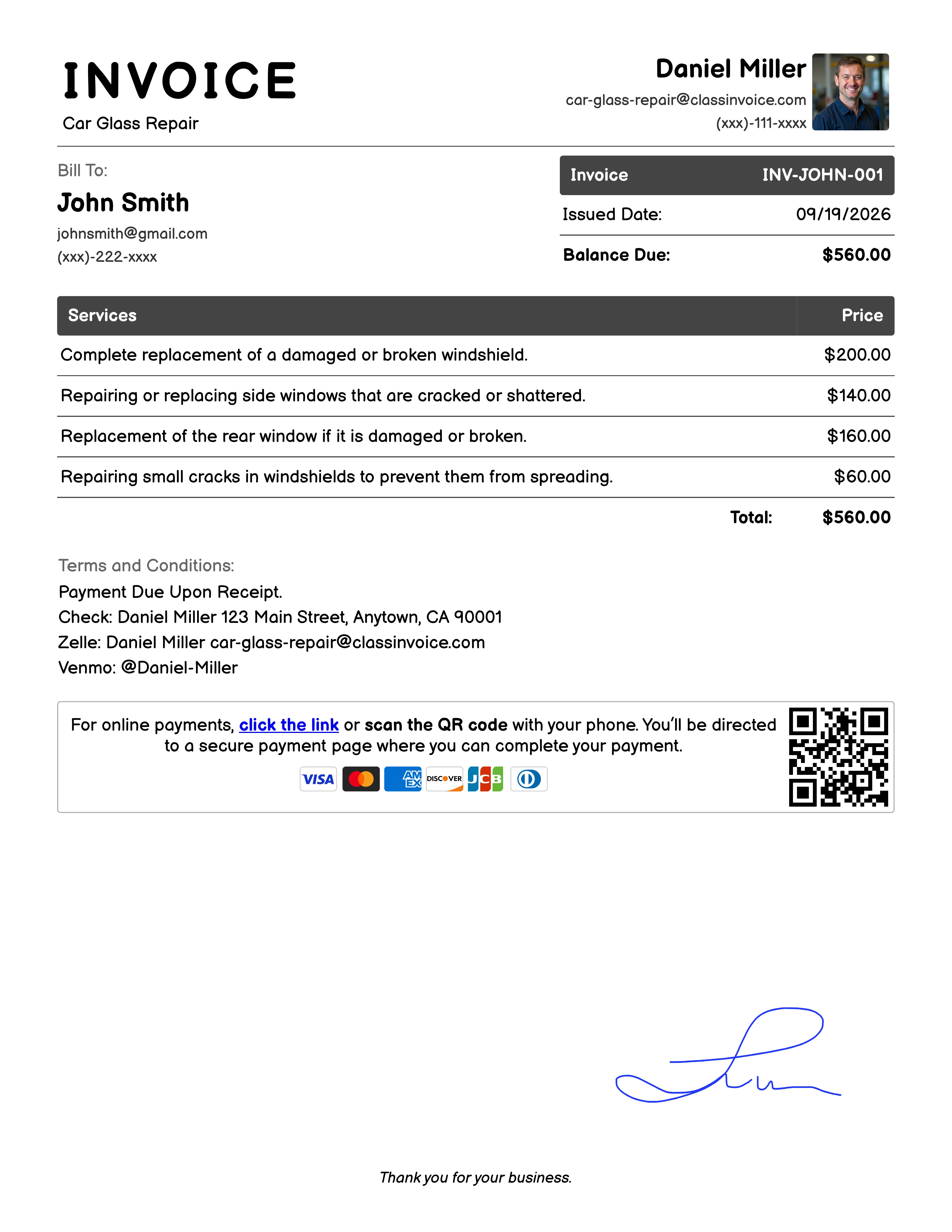 Free Car Glass Repair Invoice Generator