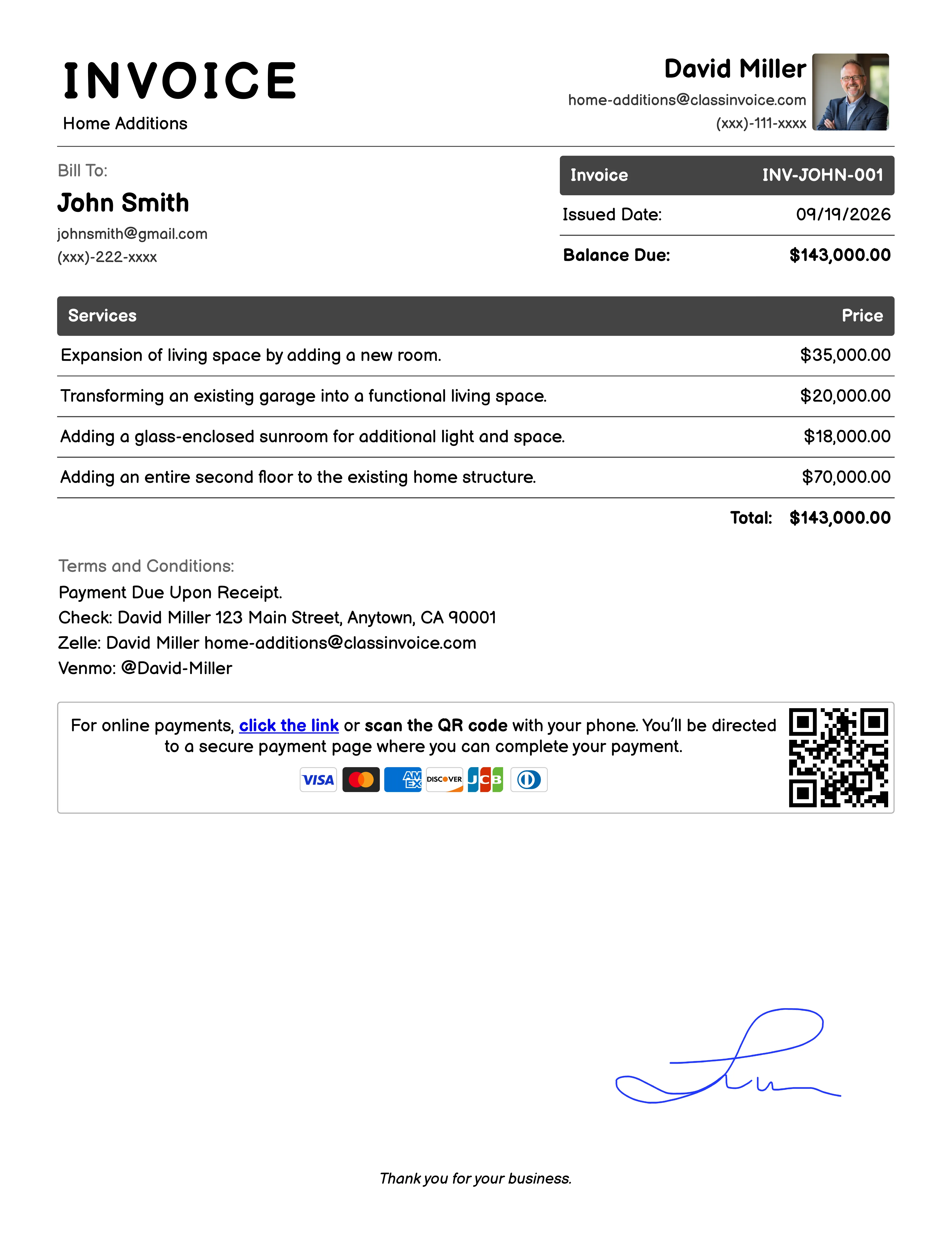The Home Additions service for sunroom or addition encompasses a comprehensive process, from initial design consultations to final finishing touches. It includes creating detailed plans, obtaining permits, preparing the site, and constructing foundations, roofing, and interior frameworks. The service ensures energy efficiency with proper insulation and culminates in installing windows, doors, painting, and flooring. This service is invoiced based on each phase of work, providing transparency and clarity for budgeting throughout the project.