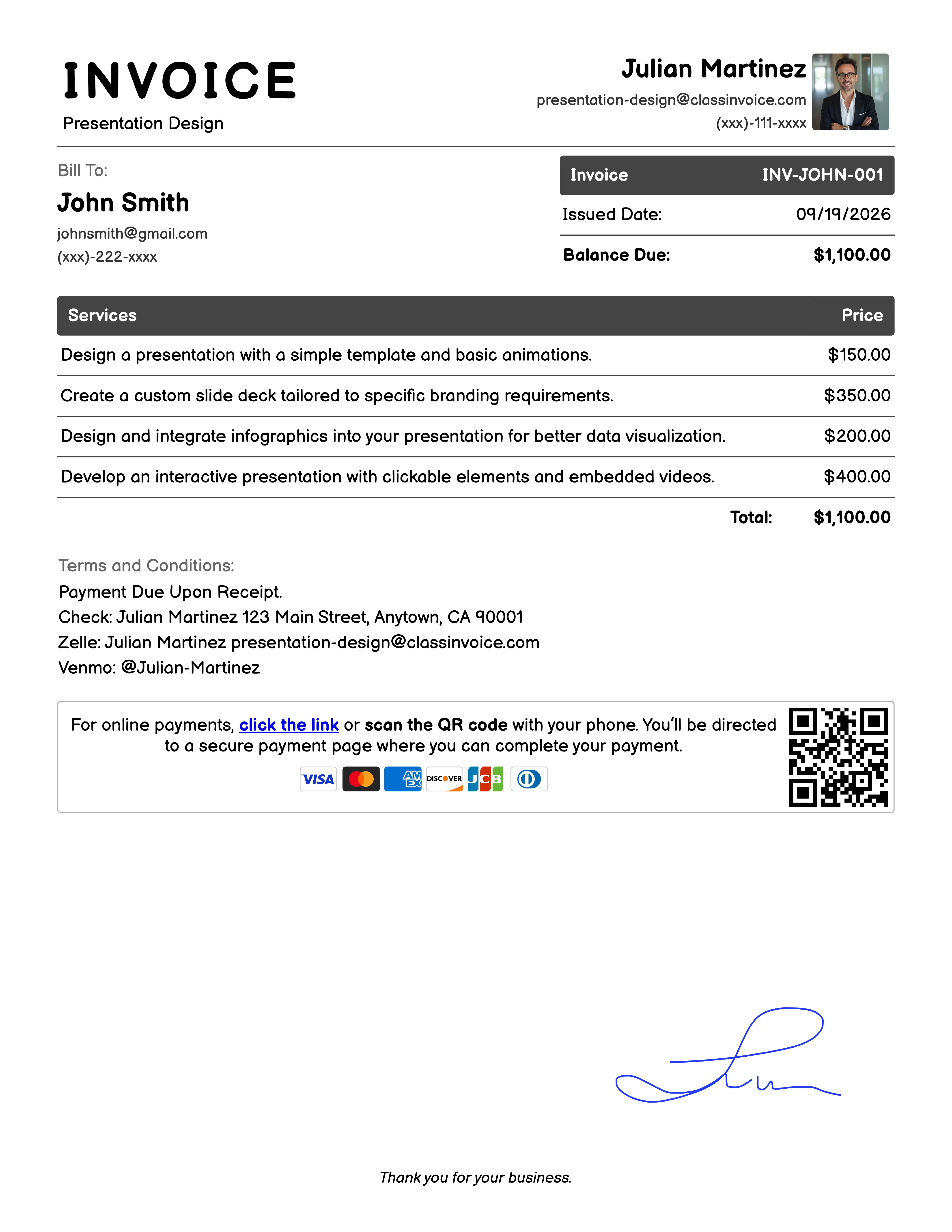 You can print your invoices directly from the invoice creation tool, or download them in PDF format for free.