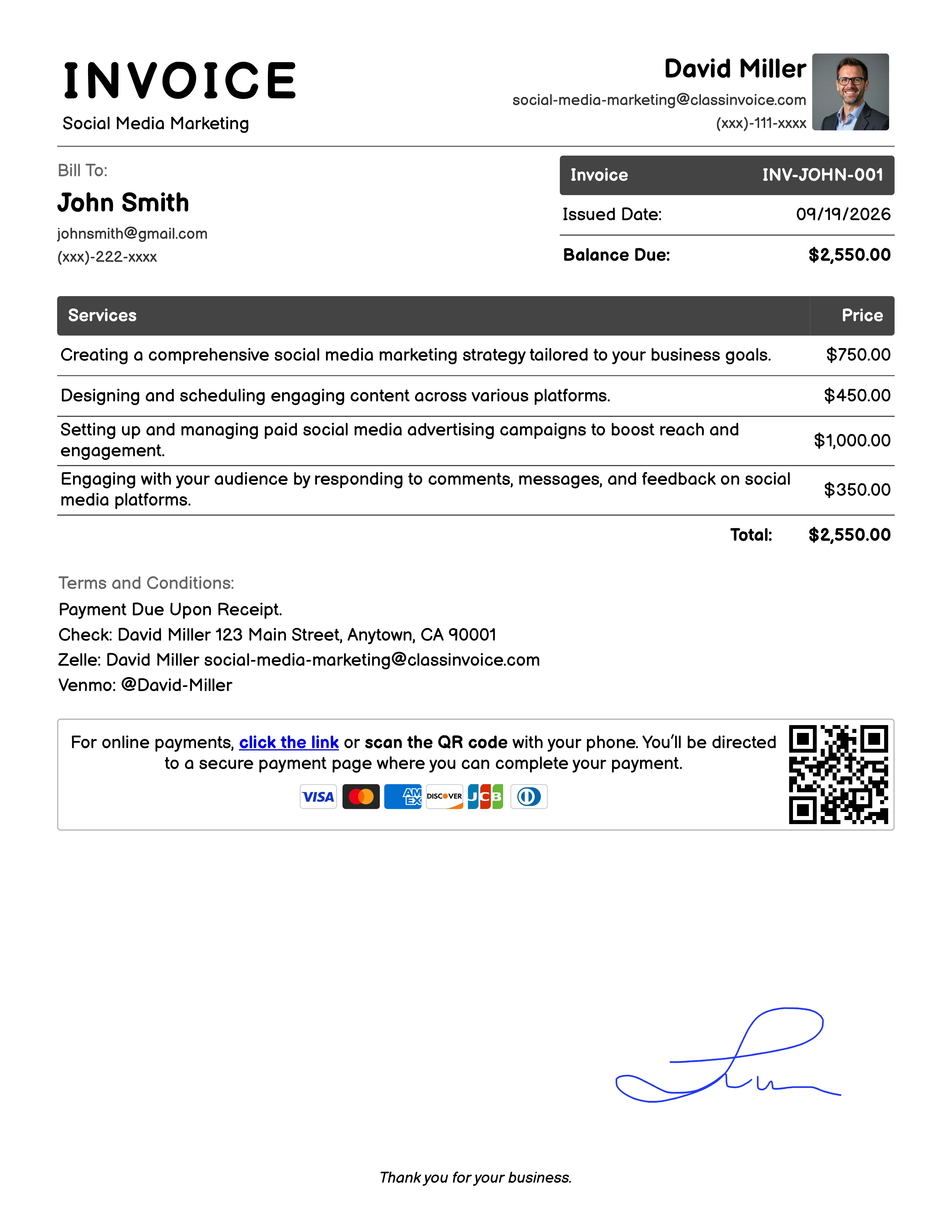 You can print your invoices directly from the invoice creation tool, or download them in PDF format for free.