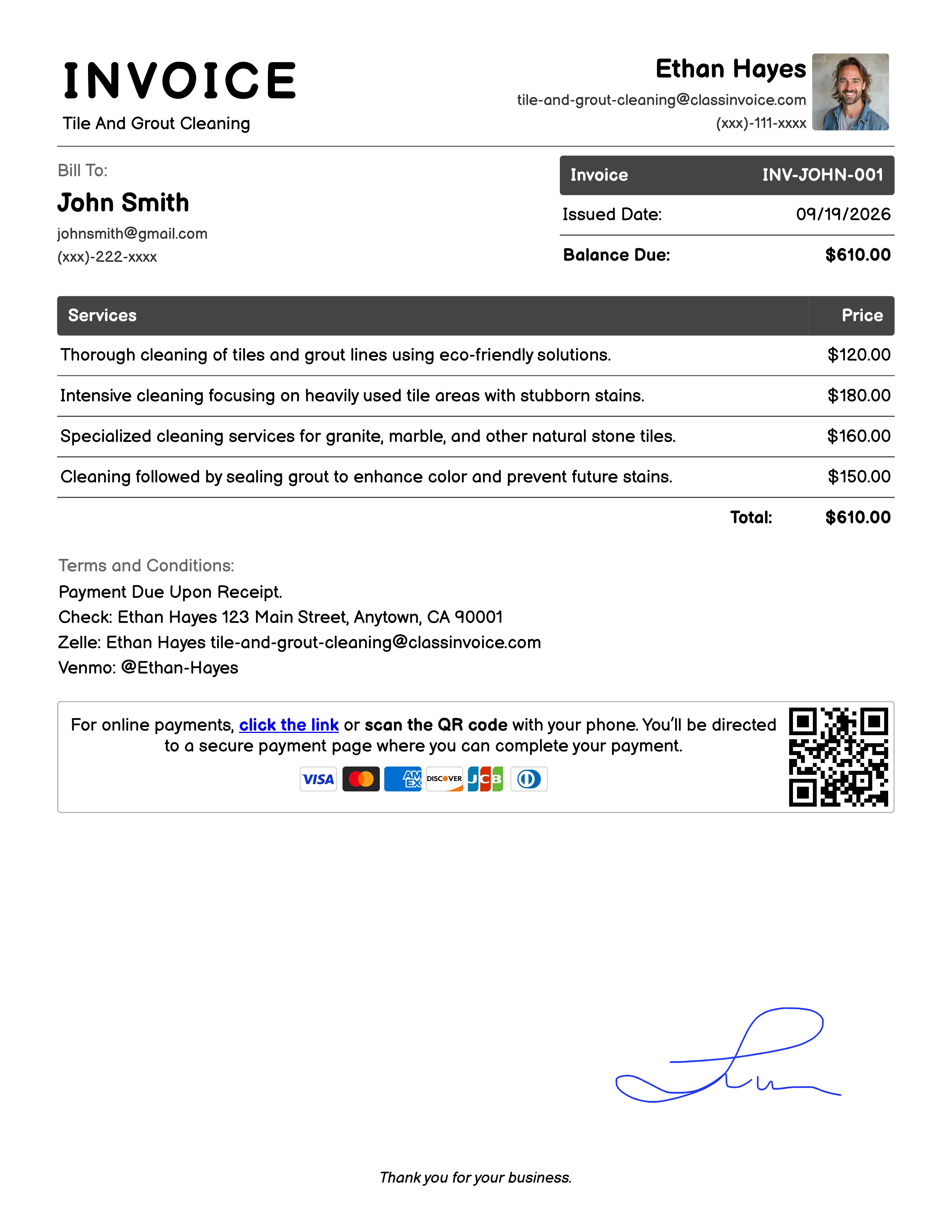 Standard Tile and Grout Cleaning Invoice